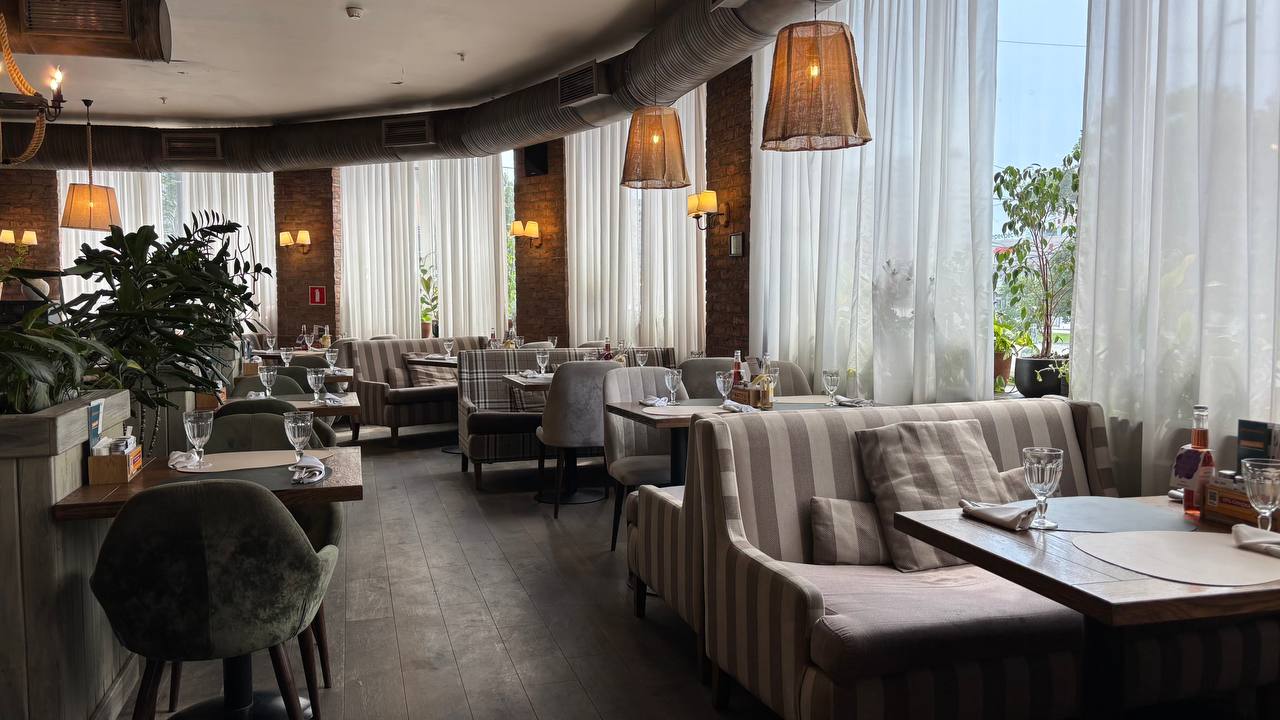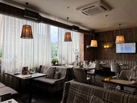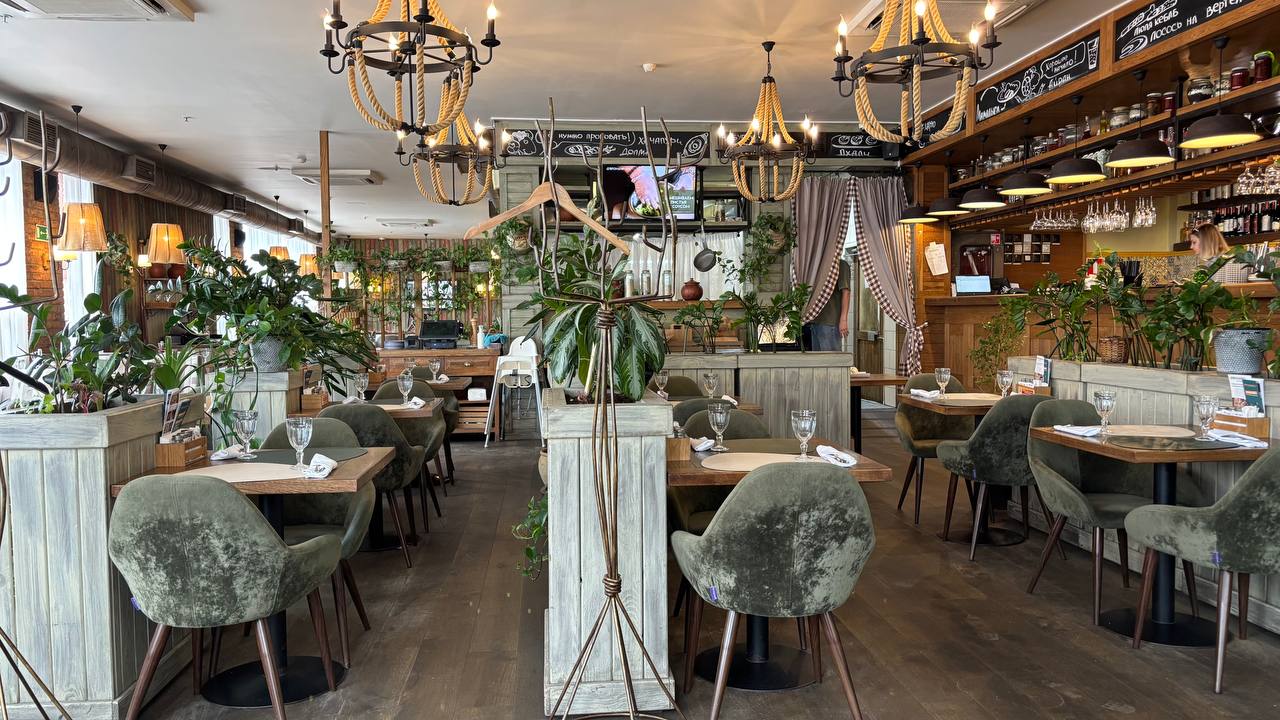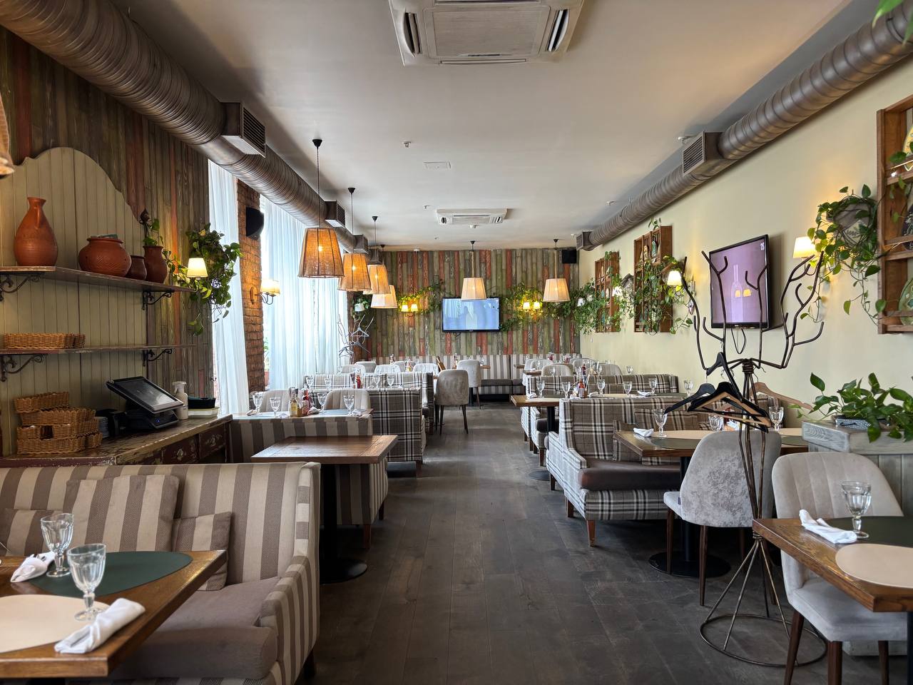 Интерьер заведения напоминает уютный и гостеприимный грузинский дом. Тут теплая палитра оттенков, панорамное остекление, много натурального дерева. Окна обрамили светлыми занавесками, над столиками развесили необычные люстры с декором из каната, абажуры и бра с теплым светом, локации зонировали комнатными растениями в ящиках, для декора расставили глиняные национальные кувшины. Для гостей выбрали обтянутые велюром кресла и диванчики с текстильной обивкой в полоску и клетку. Оборудован банкетный зал для камерных мероприятий.