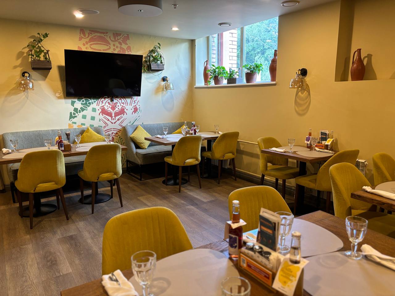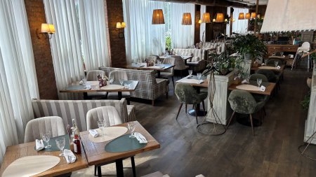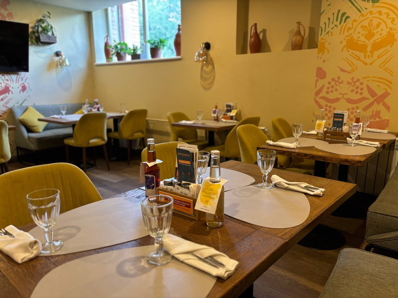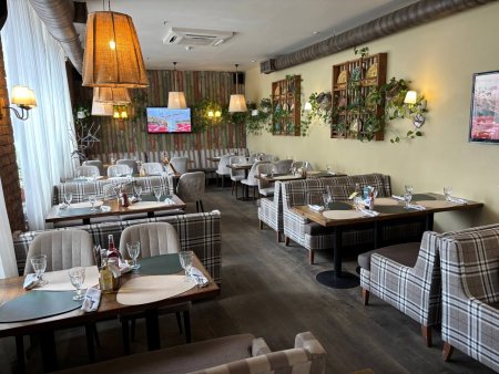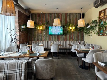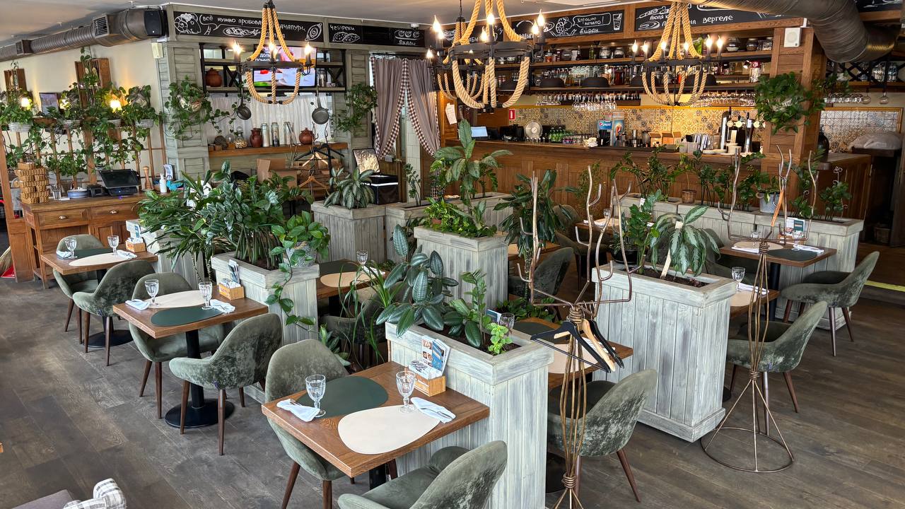 Интерьер заведения напоминает уютный и гостеприимный грузинский дом. Тут теплая палитра оттенков, панорамное остекление, много натурального дерева. Окна обрамили светлыми занавесками, над столиками развесили необычные люстры с декором из каната, абажуры и бра с теплым светом, локации зонировали комнатными растениями в ящиках, для декора расставили глиняные национальные кувшины. Для гостей выбрали обтянутые велюром кресла и диванчики с текстильной обивкой в полоску и клетку. Оборудован банкетный зал для камерных мероприятий.
